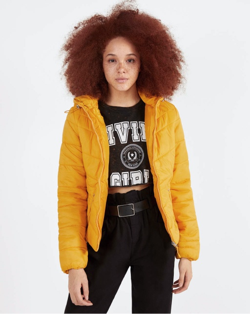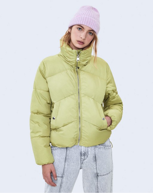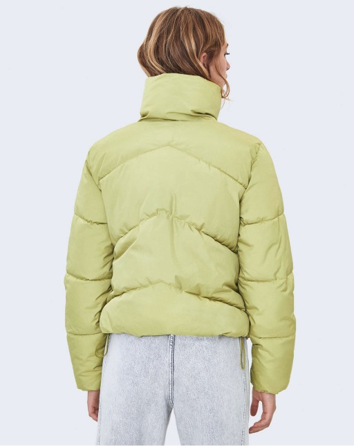 The insulated jacket is made of leather. A light layer of insulation. Details: stand-up collar, zipper, two pockets on the sides.